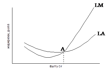 Кривая долговременных предельных издержек LMC определяется с помощью кривой долговременных средних издержек. Она находится ниже кривой долговременных средних издержек, когда LAC снижается, и выше, когда LAC идет вверх. Две кривые пересекаются в точке А, где кривая долговременных средних издержек достигает своего минимума.