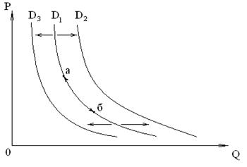 Под влиянием изменения цены товара изменяется величина спроса на данный товар, что ведет к перемещению от одной точки к другой на постоянной кривой спроса, на графике от а к б иот б к а (рисунок 6.4). При снижении цены возрастает величина спроса, при повышении цены снижается величина спроса, но сам спрос как выражение потребности в данном товаре остается неизменным (на рисунок 6.4 он изображен кривой D1).