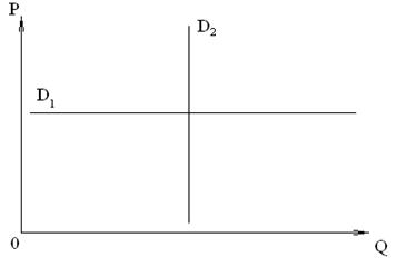 И, наоборот, когда говорят о совершенно неэластичном спросе, имеют в виду крайний случай, когда изменение цены не приводит ни к какому изменению количества спрашиваемой продукции. Графически этот случай показывают при помощи линии спроса, параллельной вертикальной оси, например, D2 (рисунок 6.11).
