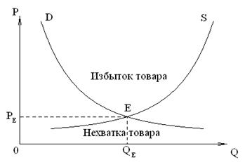 Если совместить кривые спроса (D) и предложения (S) на одном графике (рисунок 6.13), то точка пересечения кривых (Е) показывает, что здесь спрос равен предложению и ее координатами являются: равновесная цена РЕ и равновесное количество товара Q E.