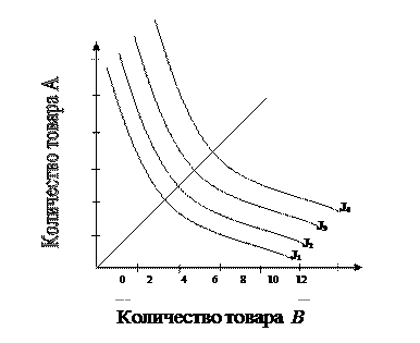 Каждая кривая соответствует различной величине совокупной полезности. Каждая следующая кривая безразличия, проходящая дальше от начала координат, предполагает относительно большую величину полезности. Любая комбинация товаров А и В, показанная точкой на кривой J4, обладает большей полезностью, чем любая комбинация А и В, показанная точкой на кривых J3, J2 или J1. Это видно, если провести прямую в первую четверть от начала координат. Точки ее пересечения с каждой последующей кривой соответствуют большему количеству как товара А, так и товара В и, следовательно, большей величине совокупной полезности.