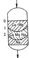 0 – 1 – слой истощенного катионита; 1 -2 – слой работающего катионита; Na – слой свежего катионита.