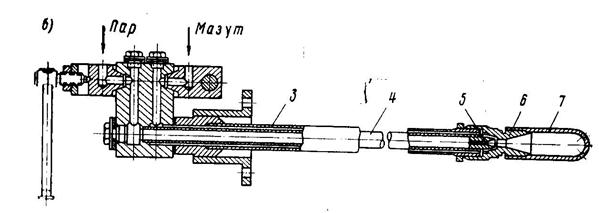 Пар движется по внутренней трубе 4, заканчивающейся сужающе–расширяющимся соплом 5, в котором струя пара приобретает скорость до 1000 м/с. Мазут движется по кольцевому каналу и выходит из него через кольцевую щель. Здесь мазут подхватывается струей паром, и через диффузор 6 вносится в топку и распыливается. Для уменьшения длины факела применяется насадок с отверстиями, который гасит энергию струи.