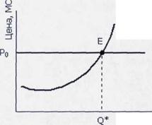 Это правило проиллюстрировано графически на рис. 2. Ро — это цена, при которой фирма может продать любое количество своей продукции. Эта цена принимается совершенно конкурентной фирмой как данная. Кривая краткосрочных предельных издержек обозначена МС. Предельные издержки растут при высоких объемах выпуска вследствие закона убывающей отдачи. Оптимальный положительный объем выпуска достигается в точке Е, соответствующей выпуску Q*, в которой Ро = МС.