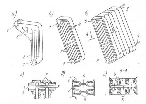 1 – ниппельные головки; 2 – ребра; 3 – пережимы; 4 – каналы для движения газов; 5 – стяжные болты; 6 – шайбы; 7 – ниппели; 8 – каналы для движения воды.