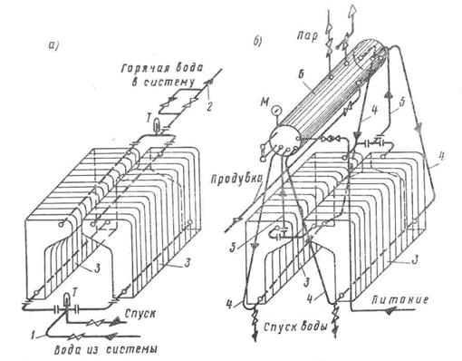 1 – подвод воды; 2 - отвод воды; 3 – пакеты секций; 4 – опускные циркуляционные трубы; 5 – подъемные трубы; 6 - барабан.