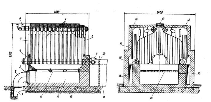 1 – дутьевой канал; 2 – патрубок воздуховода; 3 – зольниковая дверца; 4 – загрузочная дверца; 5 – передняя дверца; 6 – патрубок для отвода воды; 7 – средние секции; 8 – задняя секция; 9 – патрубок для подвода воды; 10 – шибер; 11 – боров; 12 – фундамент; 13 – зольник; 14 – колосниковая решетка; 15 – дымовые каналы; 16 – обмуровка; 17 – обвязочный каркас; 18 – отверстия для чистки газоходов; 19 – проставка из кирпича.
