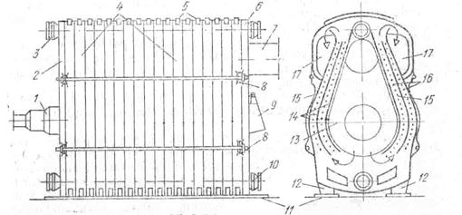1 – горелочное устройство; 2 – передняя секция; 3 – патрубок для отвода воды; 4 – средние секции; 5 – съемные крышки для чистки газоходов; 6 – задняя секция; 7 – патрубок для отвода газов; 8 – стяжные котлы; 9 – взрывной предохранительный клапан; 10 – патрубок для подвода воды; 11 – металлические пластины; 12 – стойки секций; 13 – топочная камера; 14 – ребра секций; 15 – газоходы с продольны движением газов; 16 – завихрители; 17 - газоходы с поперечным движением газов.