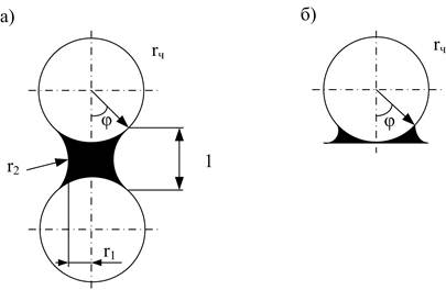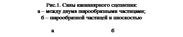 Помимо рассмотренных выше видов взаимодействий и соответствующих структур необходимо выделить такие важные взаимодействия, как капиллярные, проявляющиеся в трехфазных (твердое – жидкость – газ) дисперсных системах, к которым относятся подавляющее большинство сырьевых (бетонных, растворных, силикатных и т.п.) смесей для изготовления строительных материалов. На рис.1 показано искривление жидкости в зазоре между двумя частицами шарообразной формы, а также между шарообразной частицей и плоскостью, приводящее к их стягиванию в результате растяжения жидкости и появления в ней отрицательного капиллярного давления (основная составляющая силы капиллярного сцепления). Преобладание капиллярных сил над другими составляющими межчастичного взаимодействия особенно заметно для частиц размером более 10 мкм и вплоть до 1-2 мм. Именно действием сил капиллярного сцепления объясняются экстремальные зависимости насыпного объема, уплотняемости сырьевых смесей, а также прочности свежесформованных изделий. Капиллярное сцепление проявляется также в капиллярно-пористых телах, структурные элементы которых в основном соединены другими связями некапиллярного характера. В этих телах силы капиллярного сцепления создают внутренние напряжения, вызывающие усадочные деформации, а также влияют на прочность материала.