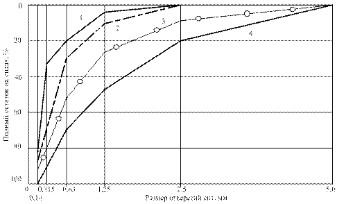 и выше; 3 ─ нижняя граница крупности песка (модуль крупности 2,5)