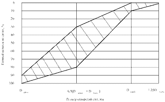 Зерновой состав крупного заполнителя характеризуют наибольшей и наименьшей крупностью его зерен. Наибольшая крупность щебня (гравия) определяется размером отверстия сита, на котором полный остаток не превышает 5 %, наименьшая – размером сита, на котором полный остаток не менее 95 %. Кривая просеивания щебня (гравия) должна располагаться в пределах заштрихованной площади графика зернового состава, т.е. в области плотных смесей (рис.7).