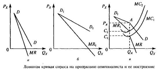 В связи с этим олигополист сталкивается с ломаной кривой спроса на выпускаемый им товар (рисунок в). Говоря другими словами, если фирма А повышает цену сверх уровня РА, то остальные две фирмы используют отрезок DSA (игнорируют повышение цен), а если цена снижается ниже уровня PА, то фирмы Б и В используют отрезок AD, т. е. выравнивают цены.