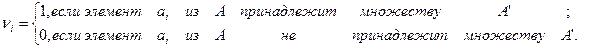 Пусть А = { a l, а2,..., аn,} - некоторое конечное множество, элементы которого перенумерованы. При работе с конечными множествами на вычислительных машинах такие множества часто задают с помощью характеристических векторов. Пусть А'
