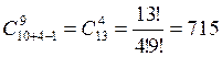 Нетрудно убедиться, что между "кодами" и комбинациями существует взаимно однозначное соответствие. Таким образом, каждой комбинации из n элементов по т соответствует последовательность из т единиц и n - 1 нулей (в рассмотренном примере n = 4, т = 2). Следовательно, число всех комбинаций из n элементов по т с повторениями равно числу последовательностей, состоящих из т единиц и n - 1 нулей, т. е.