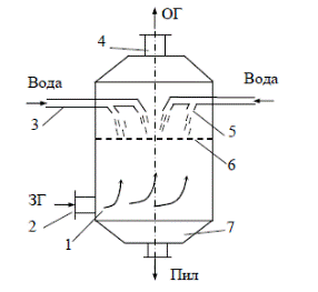 Суть циклонного процесу полягає в тангенціальному поданні потоку газу, що підлягає очищенню, крізь вхідний патрубок 1. Завдяки тангенціальному введенню і наявності центральної вивідної труби 4 потік починає обертатися навколо неї, здійснюючи при проходженні крізь апарат декілька оборотів. Під впливом відцентрової сили зважені частинки забрудненого газу відкидаються на стінки внутрішньої поверхні корпусу 7, і далі під дією сили тяжіння потрапляють в конічне дно і видаляються через нижній патрубок. Циклонні сепаратори ефективно очищають гази, що містять часточки розміром не менше ніж 25 мкм. Коефіцієнт корисної дії циклонів залежить від концентрації пилу і розмірів його часточок. Середня ефективність знепилення газів у циклонах становить 78-86 % для пилу розміром 30–40 мкм. Основним недоліком циклонів є значне абразивне спрацювання частин апарата пилом. Тому ці частини вкривають синтетичними матеріалами або стійкими до стирання сплавами, а це підвищує вартість конструкції апарата.