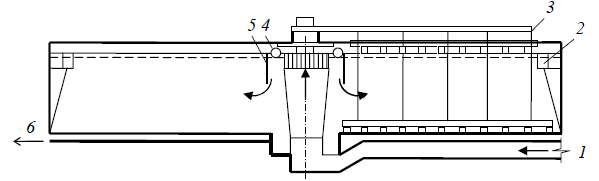 1 – подача стічної води; 2 – збірний лоток; 3 – скребковий механізм;