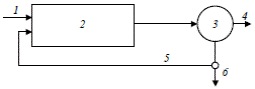 1 – стічна вода; 2 – аеротенк; 3 – вторинний відстійник; 4 – очищена вода; 5 и 6