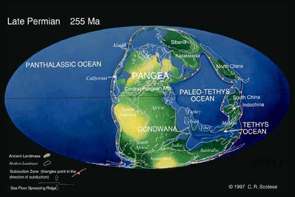 Тектоника. Массивы почти всех древних платформ соединились – завершилась герцинская складчатость, и на планете возник единый континент Пангея. Вокруг него раскинул воды океан Панталасса, а с востока внутрь Пангеи вклинивается океан Палеотетис. В состав Пангеи не вошли только три платформенных области: Северного и Южного Китая и Индокитая – они служили восточным обрамлением Палеотетиса. В конце перми и эти платформы слились, превратив Палеотетис в замкнутый бассейн. От Гондваны откололись и двинулись на север центральные массивы современных Анатолийского, Иранского и Тибетского нагорий. В пермском периоде уровень морских вод упал до минимальной отметки (за всю историю фанерозоя). Герцинский орогенез сопровождался крупнейшим вулканизмом на территории Сибирской платформы – из трещин изливались потоки базальтовых лав, формируя огромные трапповые покровы. Гигантские размеры суши и обмеление океана обусловили невиданную степень аридности климата, что привело к сокращению роли споровых растений, и росту значения голосеменных. Шельфовые моря превращались в лагуны, где активно накапливались соли – свыше 80 % мировых запасов калийной соли имеют пермский возраст. Произошло крупнейшее за всю историю вымирание живых организмов. В конце пермского периода начался раскол Гондваны, ее обширные участки вновь испытали покровное оледенение.