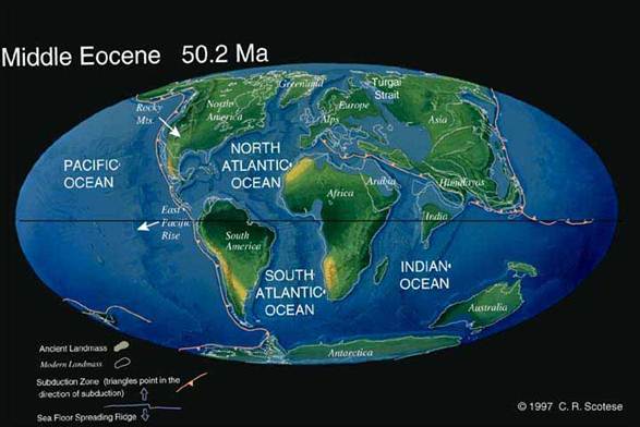 Африканская литосферная плита продвинулась севернее, и Тетис разделился на две части: западную и восточную. На западе началось оформление Альп, гор Балканского полуострова и складчатого обрамления Анатолии. С Евразией столкнулась Иберия – возникли Пиренеи. В результате горообразования западная часть Тетиса также распалась на Западный Паратетис (соединял Атлантический и Индийский океаны) и Восточный Паратетис (от предгорий Альп по Аральское море). Индостан приближался к Евразии – продолжалось сужение восточной окраины Тетиса, которая временами превращалась в изолированный бассейн. В конце олигоцена восточная часть Тетиса исчезает – на ее месте возносится гигантская горно-складчатая система. В позднем эоцене Африканский рифт продолжился на юг – возникли лавовые покровы Эфиопского нагорья. В конце палеогена началось похолодание, и в горах Антарктиды возникли ледники.