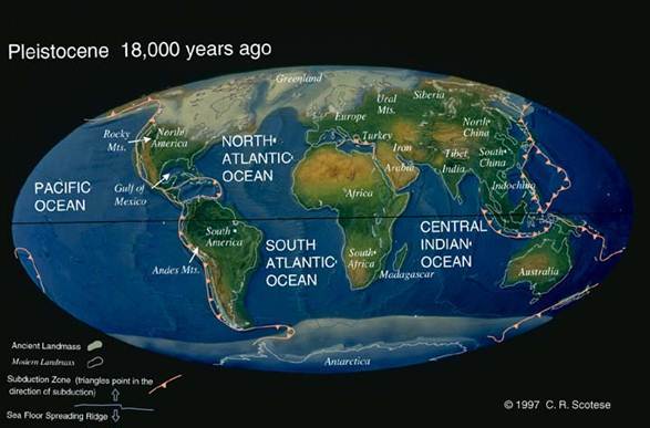 Тектоника. В миоцене вознеслись складки Анд и Северо-Американских Кордильер, оформился Панамский перешеек (рис. 14). В результате прервалась связь центра Атлантики с Тихим океаном, обособились морские течения тропических широт, и возник Гольфстрим. По мосту суши начались миграции животных между Америками. Индостан столкнулся с Евразией – вознеслись хребты Гималаев. Океан Тетис практически исчез – от него сохранилась лишь единая котловина Восточного Паратетиса, объединявшая современные Средиземное, Черное и Каспийское моря. Уровень воды в этом бассейне сильно колебался. Около миллиона лет Восточный Паратетис был изолирован, что привело к накоплению мощных соляных толщ. Около 20 млн лет назад возникли первые ледники в пределах Антарктиды. В эоцене продолжился раскол Африки – оформлялся Восточно-Африканский континентальный рифт. Индо-Австралийская и Африкано-Аравийская плиты двигались все дальше на север, наращивая складчатые массивы Средиземноморско-Индонезийского пояса. Таким образом, альпийская складчатость привела не только к росту площади суши, но и увеличению ее средней высоты, что не могло не сказаться на климате. К концу неогена глобальное похолодание усилилось, и горное оледенение Антарктиды перешло в покровное. Сформировались горные ледники в Евразии и Северной Америке. Около 5 млн. лет назад возникла Исландия, почти сразу покрывшаяся льдами.