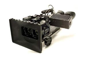 К цифровой двух поточной стереокамере можно отнести цифровую камеру компании "21st Сentury" (Фото 19). Это собранные в одном корпусе два оптических узла видеокамеры "Panasonic AG-DVX100A", но сам аппарат относится к классу цифровых рекордеров, так как оснащен встроенным двухпроцессорным компьютером на платформе MacOS X с двумя жесткими дисками по 100 Гбт, на которые происходит запись в формате RAW CCD 4:4:4 при 10 битах на канал в 36 битном цвете. Запись идет в разрешении 1280*720 при скорости съемки 24 кадров в секунду. Это единственная до настоящего времени двухпоточная цифровая камера, которая оснащена электронной бинокулярной лупой, что позволяет оператору непосредственно при съемке наблюдать снимаемое изображение в трехмерной визуализации. Камера была разработана в начале нынешнего столетия и, возможно, в исполнении на современных компонентах (твердотельные карточки записи, использование мультиформатного метода записи) по своим эргономическим показателям смогла бы максимально приблизится к цифровым киноаппаратам традиционного кинематографа. Но, как и во всех двух поточных камерах, здесь не была решена проблема уменьшения базиса съемки по сравнению с базисом зрения. Объективы с большой апертурой, заимствованные из традиционного кинематографа, не позволяют сблизить их на малое межосевое расстояние, достаточное для съемки без эффекта миниатюризации. Впоследствии компания разработчик этой камеры отказалась от такого решения и перенесла свои работы в нишу двухкамерных систем на полупрозрачном зеркале.