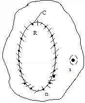 Для этого рассм-м область R, ограниченную контуром С. Часто легче находить аналитическое решение ДУ частных производных, для неограниченной области, чем для фактически заданной области. Поэтому предположим, что наша область R находится внутри бесконечной, неограниченной области. Предположим так же, что нам известно некоторое аналитическое решение для всей бесконечной области и это решение удовлетворяет граничным условиям, заданным на границе С. В этом случае мы можем считать, что мы имеет данные для исходной задачи. На практике чрезвычайно маловероятны, чтобы сингулярное решение удовлетворяло необходимым граничным условиям.