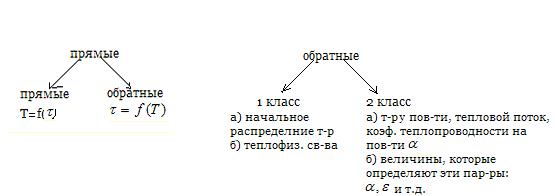 Для задач 2-го класса: определение условий внешнего обмена между телом и средой, а именно, вычисление т-р наружной поверхности, интенсивности теплового потока, коэф. теплообмена, степени черноты, угловых коэф. облучения, положения пов-ти фазового перехода. Как и при решении прямых задач теплопроводности используется и аналитические, и численные методы.