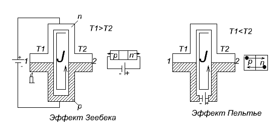Эффект Зеебека связан с возникновением в контуре, состоящем из двух полупроводников с разными типами проводимости (n и p) термотока J. Если один из паев контура 1 подогревать, температура Т1>Т2, а Т2 охлаждать, термопоток создаёт термоЭДС, возникающую из-за дифференциальных носителей и температурной зависимости контактной разности потенциалов.