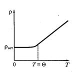 При температурах, превышающих температуру Дебая Θ, которая для металлов равна 400 – 8000С, удельное сопротивление возрастает линейно и обусловлено в основном усилением тепловых колебаний решетки. В области низких (криогенных) температур удельное сопротивление почти не зависит от температуры и определяется только сопротивлением ρост.