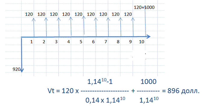 Стоит ли приобрести эту облигацию, если ее текущая рыночная цена составляет 920 долл., а приемлемая норма прибыли равна 14%?