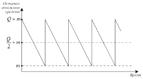 Модель Баумола применима в случаях, когда предприятие с достаточной степенью определенности может прогнозировать свои потребности в денежных средствах. При этом, как уже отмечалось, предполагается, что предприятие начинает работать, имея максимальный целесообразный уровень денежных средств Q+m. Затем предприятие равномерно (в силу устойчивой потребности) расходует эти средства в течение некоторого периода времени (см. рис. 8.5).