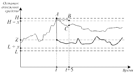 Предположим, что остаток средств на счете достиг внешнего верхнего предела (точка А на рис. 8.7.) в момент времени t. Вместо автоматического перевода величины (H – Z) из наличности в ценные бумаги финансовый менеджер делает прогноз на несколько предстоящих дней (в нашем случае — пять). Если ожидаемый остаток средств в момент (t + 5) останется выше внутреннего предела (H – x), например его размер определяется в точке В, то сумма (H – Z) будет обращена в ценные бумаги. Дальнейшая динамика остатка денежных средств в этом случае будет соответствовать жирной линии, начинающейся в момент времени t. Если же прогноз покажет, что в момент (t + 5) величина денежного остатка будет соответствовать точке С, то фирма не будет покупать ценные бумаги. Аналогичные рассуждения верны и в отношении нижнего предела.