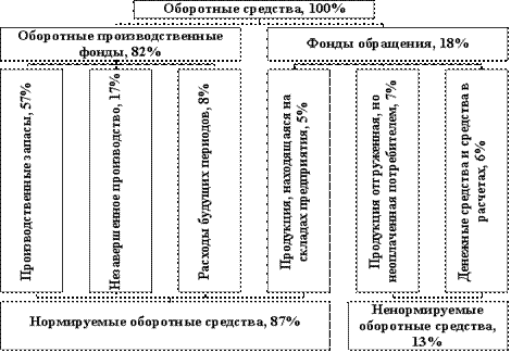 Соотношение между размерами отдельных элементов оборотных средств и их общей величиной, выраженное в процентах, называют структурой оборотных средств (рис. 2.1).
