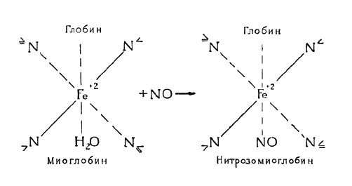 Из метпигментов могут образовываться нитрозопигменты лишь после предварительного их восстановления. Здесь оказывают влияние редуцирующие вещества, повышенная температура и наличие микробиальных ферментов — нитритредуктаз (например, в период обжарки колбасных изделий). В присутствии кислорода окись азота взаимодействует с ним, превращаясь в двуокись азота со всеми вытекающими отсюда последствиями.