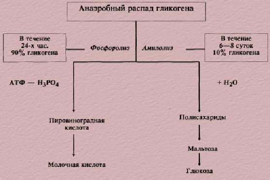 В связи с отсутствием поступления кислорода в организм ресинтез гликогена в мясе после убоя идти не может и начинается его анаэробный распад, который протекает по пути фосфоролиза и амилолиза (Рис. 21) с образованием молочной кислоты и глюкозы. Скорость гликолиза можно регулировать: введение хлорида натрия в парное мясо подавляет процесс; применение электростимуляции - ускоряет. Интенсивный прижизненный распад гликогена может вызывать стрессовые ситуации у животных.