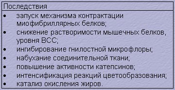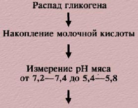 Ферментативный распад гликогена является пусковым механизмом для развития последующих физико-химических и биохимических процессов. Накопление молочной кислоты приводит к смещению рН мяса в кислую сторону от 7,2-7,4 до 5,4-5,8 в результате чего: