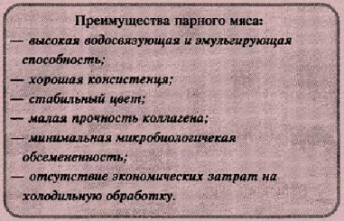 Однако, работа с парным мясом требует как высокой оперативности в технологическом процессе (интервал от момента убоя до стадии термообработки готовых изделий не должен превышать 3 часов), так и применения специальных приемов, направленных на задержку хода гликолиза и процесса взаимодействия актина с миозином. В частности, такими способами являются: