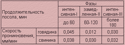 - скорость проникновения посолочных веществ неадекватна, имеет нелинейный характер и складывается из трех последовательных фаз - "интенсивной - замедленной - интенсивной" (табл. 16);