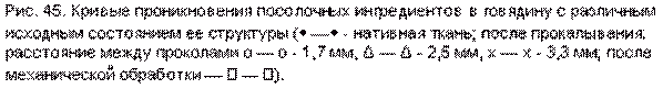 - осуществление предварительной игольной тендеризации (накаливания) сырья с шагом игл 3,3, 2,5 и 1,7 мм увеличивает скорость посола в 1,2-1,7 раз для говядины и в 1,2-1,5 раз для свинины, что обусловлено образованием дополнительных капилляров в мясе (рис. 45 и 46);