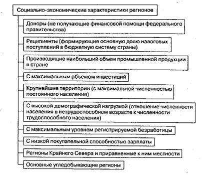 Признаки классификации (типологии) регионов. Специалистами различных научных институтов регионального профиля разработано достаточно большое количество классификаций (типологий) регионов, однако наибольшее распространение получили региональные типологии, предложенные Советом по изучению производительных сил, которые ориентированы на цели, задачи и механизмы региональной политики. Основная типология имеет три измерения: уровень социально-экономического развития, динамичность развития и природно-географические условия (климат, положение относительно центра страны, тяготение к регионам мирового рынка и т. п.). На основе наблюдаемых типологических признаков выделяются три главных типа проблемных регионов в современной России, по отношению к которым целесообразно применять особые методы регулирования: отсталые (слаборазвитые), депрессивные и кризисные.