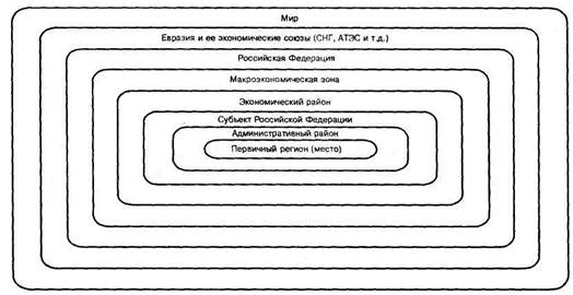 В соответствии с изложенными представлениями о регионах, типах регионов и районировании любой регион (за исключением мира в целом) является элементом некоторой иерархической системы регионов. Первичным элементом системы является место — предельно малый регион (теоретически это географическая точка).