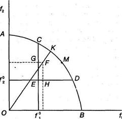 Если каждый регион хозяйствует автономно (не вступает в межрегиональное сотрудничество), то максимально достижимыми значениями целевых показателей будут f1° и f2°. Точка Е характеризует состояние автаркического развития обоих регионов.