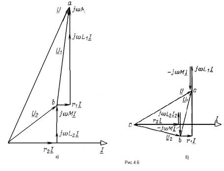На (рис. 4.5а,б) показаны векторные диаграммы для согласного и встречного включений при одинаковом значении тока в обоих случаях.