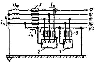 1 - корпус однофазного приемника тока; 2 — корпус трехфазного приемника тока; 3 — плавкий предохранитель; Iк — ток однофазного короткого замыкания; Ф — фазный провод; Uф — фазное напряжение