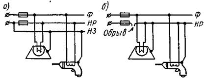 может попасть под действие напряжения. У однофазных электроприемников (светильников, ручного электроинструмента и др.), которые включаются между фазным и нулевым рабочим проводами, зануление корпусов надлежит выполнять с помощью отдельного (третьего) проводника, который должен соединять корпус электроприемника с нулевым защитным проводом (рис. 33, а, б).В таких случаях присоединять корпуса электроприемников для обеспечения электробезопасности к нулевому рабочему проводу нельзя, так как при его разрыве (перегорании предохранителя) все подсоединенные к нему корпуса окажутся под фазным напряжением относительно земли.