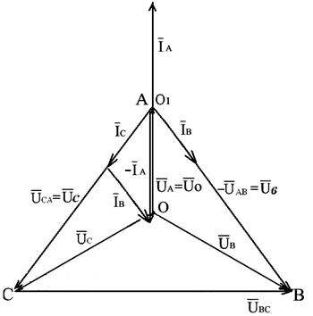 Рис.3.16. Векторная диаграмма напряжений и токов трёхфазной системы, соединённой звездой, без нулевого провода с коротким замыканием фазы A
