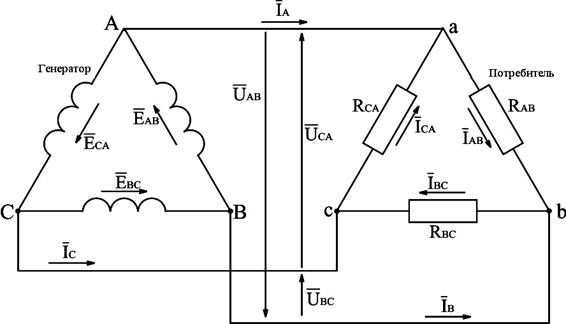 Рис.3.17. Электрическая схема трёхфазной системы, представленной в виде трёхфазного генератора и активной трёхфазной нагрузки, соединённых треугольником