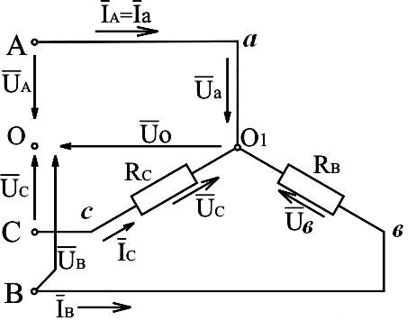 Рис.3.15. Электрическая схема трёхфазной системы, соединённой звездой, без нулевого провода с коротким замыканием фазы