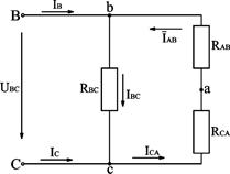 Рис.3.24. Электрическая схема трёхфазной системы, соединённой треугольником, с отключенным линейным проводом