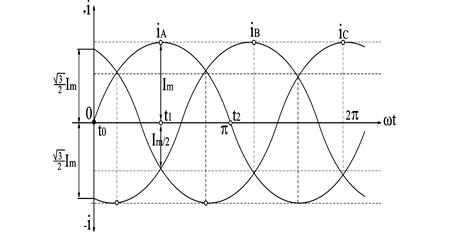 При подаче трёхфазного питания на фазы А, В, С (режим электродвигателя), по обмоткам статора пройдут мгновенные токи: